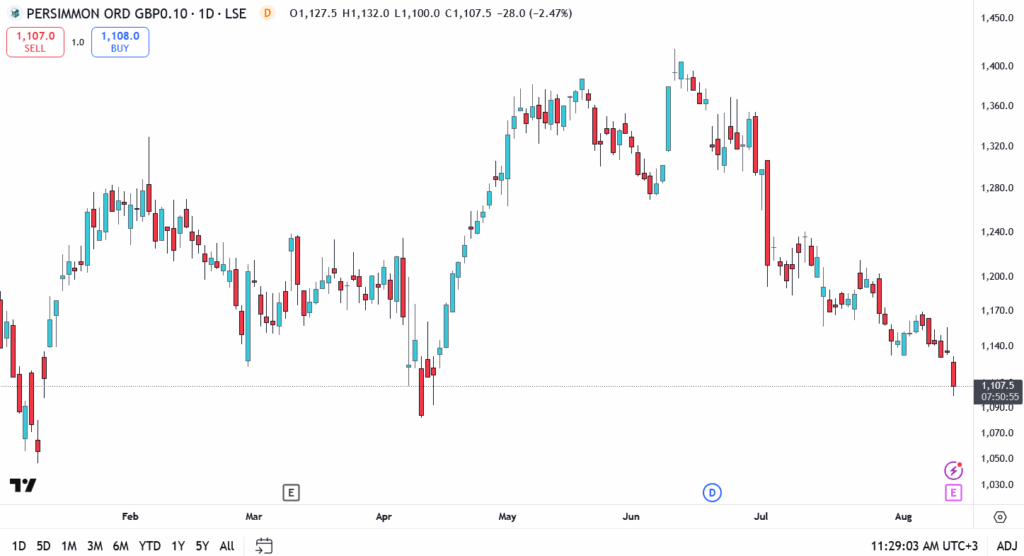 Persimmon’s chart remains in a short-term downtrend from the June peak near 1,400p. Wednesday’s decline kept the stock below its 20-day moving average, underscoring the need for a decisive break above 1,120p to turn sentiment. Failure to hold 1,050p could invite another test of the summer lows.