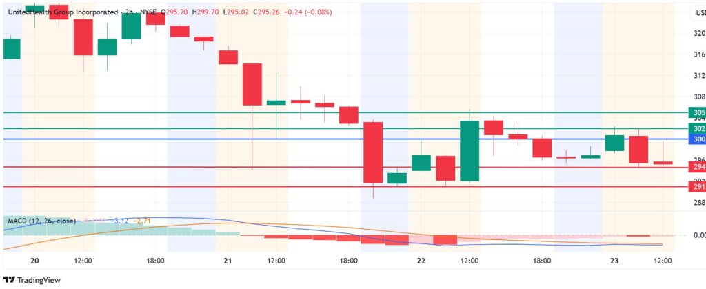 UnitedHealth stock price pivots at $300 and resistance at that level calls for further downside. The stock will likely find support at $294 initially. However, an extended control by the sellers will break below that level and test $291.