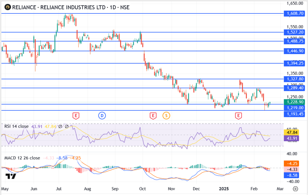 Reliance Industries (NSE: RELIANCE) is currently trading at ₹1,228.90, attempting to stabilize after testing key support at ₹1,219.00. The stock remains in a downtrend, with resistance at ₹1,289.40 and a potential breakout target of ₹1,327.80. A failure to hold above support could see a retest of ₹1,193.45, a critical level for bulls to defend.