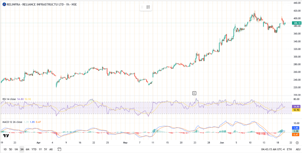 Reliance Infra is showing real signs of revival, not just in news flow but on the chart. The 4% jump this week wasn’t random, it was a reaction to a real partnership with geopolitical significance. With the MACD and RSI confirming a bullish bias and ₹400 acting as a psychological breakout zone, the next few sessions could be pivotal.