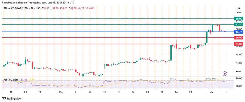 Reliance Power share price pivots at Rs 58.77 and the momentum signals control by the buyers. The stock will likely encounter initial resistance at Rs 62.20, but a stronger momentum could break above that level and send the action higher to test Rs 65.20.