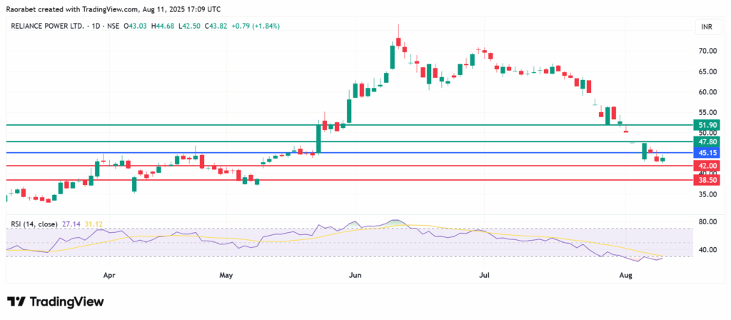 Reliance Power share price has its pivot at ₹ 45.15 and the RSI indicator reading favours the downside to prevail. That will likely see primary support established at ₹ 42. However, an extended control by the sellers will break below that level and could potentially test ₹38.50.