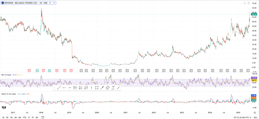 Technically, this is a clean breakout. The stock cleared resistance near ₹54 earlier this week and has now made a fast move to ₹60. RSI is at 76.93, stretched but still holding. MACD is climbing, with no sign of bearish divergence yet.