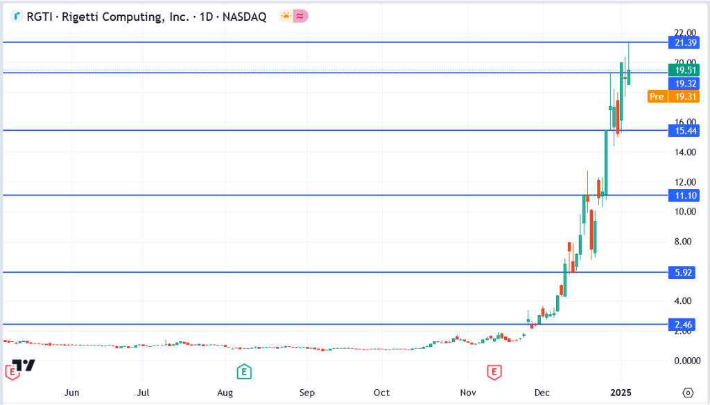 Technically, Rigetti’s chart highlights a stock navigating through a period of consolidation after its December highs. The $15.44 level has emerged as a crucial support, with $21.39 acting as a near-term resistance. A breakout above $21.39 could reignite bullish momentum, potentially targeting the psychological $27 level. On the downside, a dip below $15.44 could expose Rigetti to deeper pullbacks, with $11.10 providing the next line of defense.