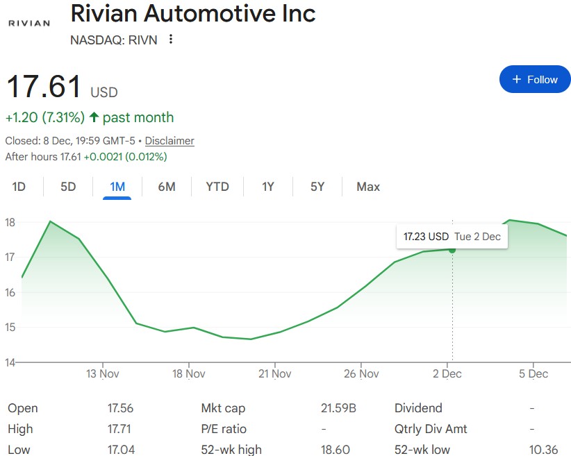 Rivian (RIVN) is trading near $17.61 as of the latest close on December 8, 2025, giving the EV maker a market capitalization of about $21.59 billion. The stock has climbed steadily over the past month, gaining more than 7 percent, and recently touched a fresh 52-week high of $18.60. Despite this recovery, Rivian still trades well below its IPO price of $78.