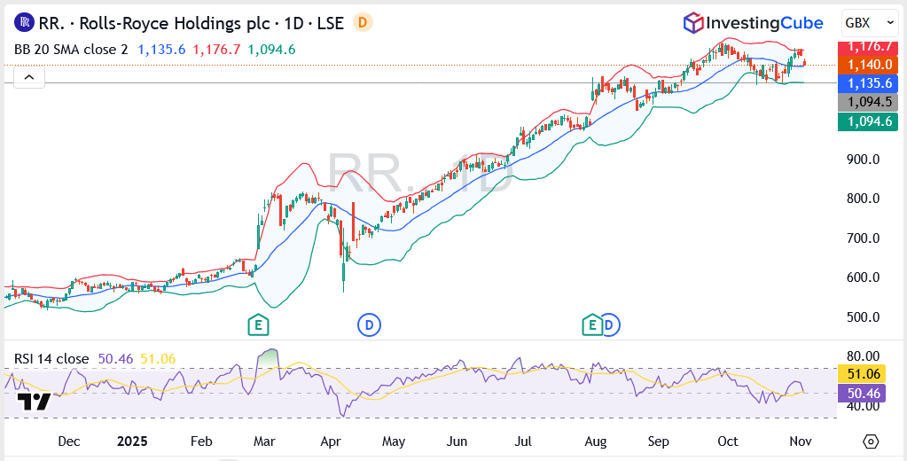 The latest chart shows Rolls-Royce consolidating near the upper Bollinger Band between 1,135p and 1,176p, indicating strong underlying demand. The 20-day simple moving average, currently around 1,135p, is acting as an important support level, while the lower band near 1,094p forms the next layer of stability.