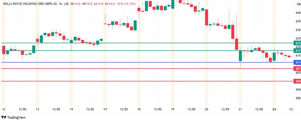 Rolls Royce share price pivot at GBX 611 and the momentum favours the buyers to be in control above that level. The stock wil likely meet the first resitance at GBX 617. However, a stronger momentum will break abive that level and potentially encounter the second hurdle at GBX 622.