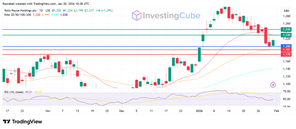 Rolls-Royce (LSE: RR.)has come back strong in the FTSE 100 in recent years, but even the best companies face challenges. After its stock rose to nearly 1,300p in January 2026, it has lost some steam. Rolls-Royce stock price recently tested the 1,200p level, which has some people worried about a bigger drop. Let’s look at why the stock is down, what could make it go back up, and what risks are out there, based on what the market is saying.