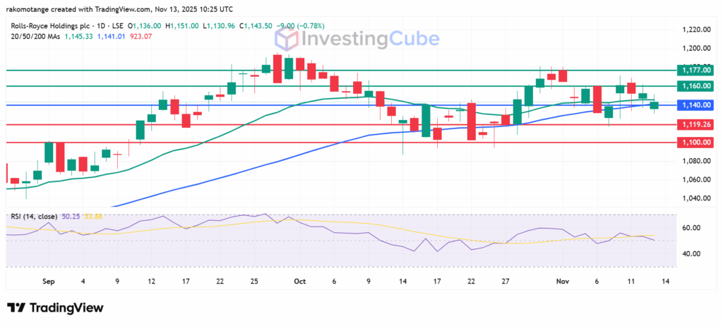Rolls Royce share price daily chart on November 13, 2025, with key support and resistance levels. Source: TradingView