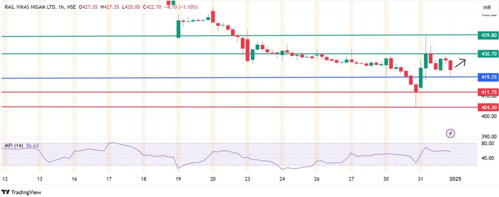 RVNL share price ended the year on a high note, gaining 3.5% on New Year’s eve to close at Rs 422.70. The stock is attempting to reverse from a double-top pattern and -4.8% in monthly losses that have resulted in weak traction. Rail Vikas Nigam Limited has benefitted greatly from a strong order book and intensive infrastructure investment by the Indian government in 2024.