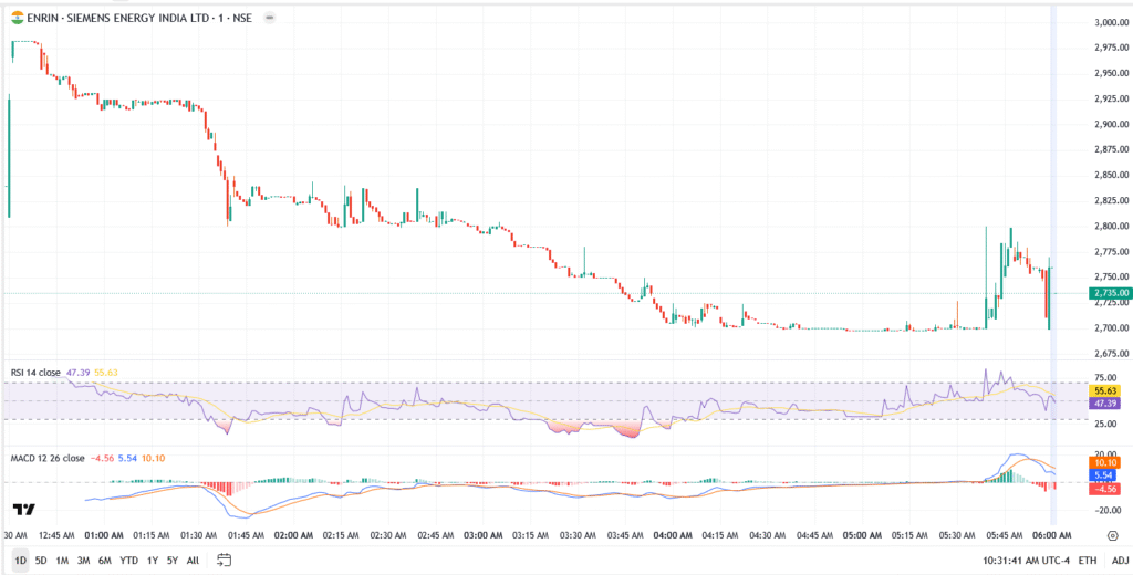 Siemens Energy India Ltd (NSE: ENRIN) extended its post-listing weakness on Thursday, slipping to ₹2,735 in early trade. The stock has now dropped nearly 13% from its debut high near ₹2,990, as investors take a breather following the buzz around its recent demerger from Siemens Ltd.