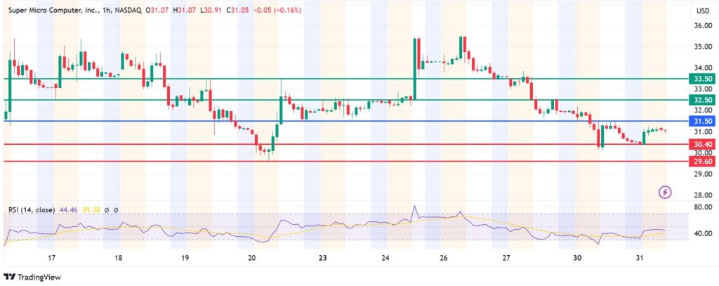 Pivot: Super Micro Computer stock price pivots at $31.50, and the momentum calls for further downside if resistance stays above that level.