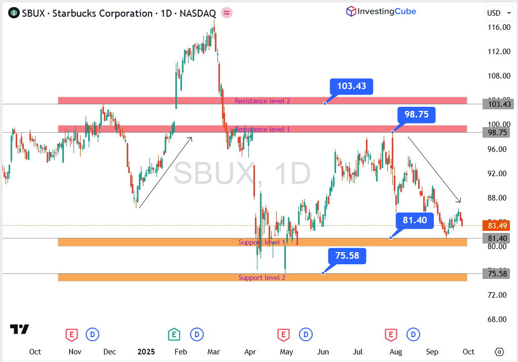 If Starbucks can defend the $81.40 level, the stock has room to steady and stage a recovery. Slip under $75.58, though, and the tone turns bearish quickly. For momentum to swing back to the bulls, a clean push through $98.75 is the key test.