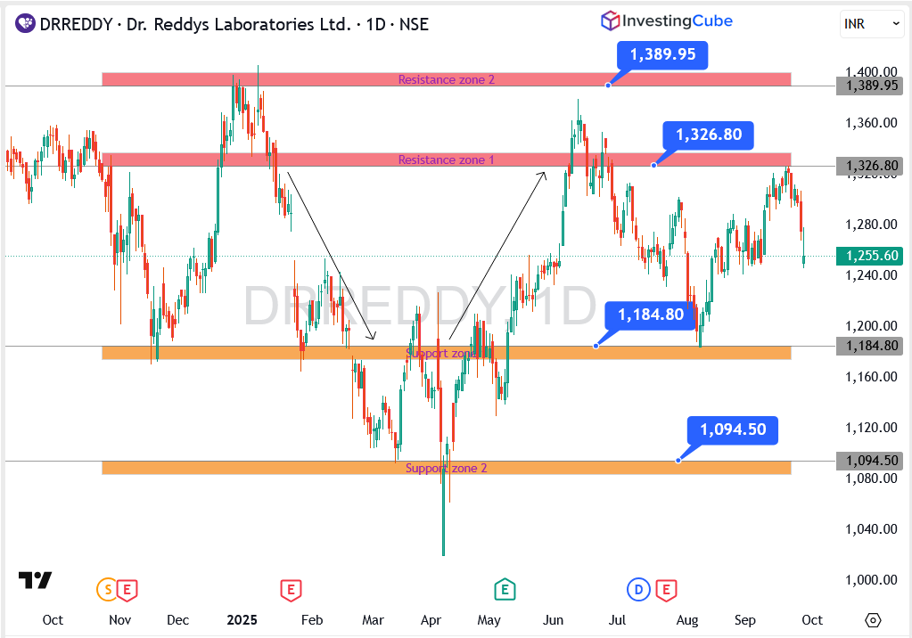 Dr. Reddy’s stock is testing key levels after the tariff shock, and the chart shows a clear battle between buyers and sellers.