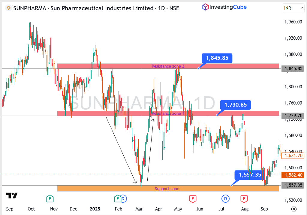 In short, Sun Pharma remains range-bound between ₹1,557.35 and ₹1,730.65. Bulls need momentum above ₹1,730.65 to shift the bias back to the upside, while a drop below ₹1,557.35 would tilt the outlook bearish.