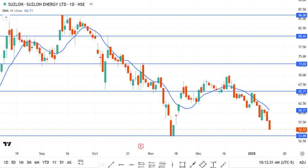 Suzlon Energy’s stock price has faced a turbulent week, with the bears firmly in control. Starting the week near ₹62, the stock steadily declined, breaking through key support levels to hit ₹55.57 by Friday. This downward move reflects weak investor sentiment and aligns with broader market pressures. The breach of the ₹60.71 level, which coincides with the 10-day SMA, has further cemented the bearish outlook for the short term.