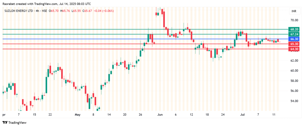- Suzlon Energy share price has been trading in a tight range of between ₹65-₹66 for the last week and a near-term breakout is unlikely.