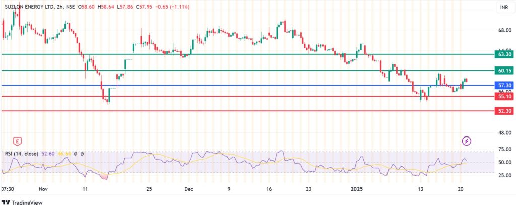 Pivot: Suzlon share price pivots at Rs. 57.30 and the momentum signals the likely continuation of the upside. Action above that level will favour the buyers to be in control. Otherwise, the downside could prevail.