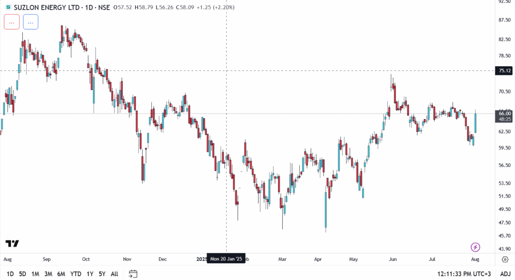 The stock’s sharp move today tells its own story. After drifting in a range for weeks, Suzlon is now catching fresh interest from investors, especially as it pushes back above critical chart levels at the start of August.