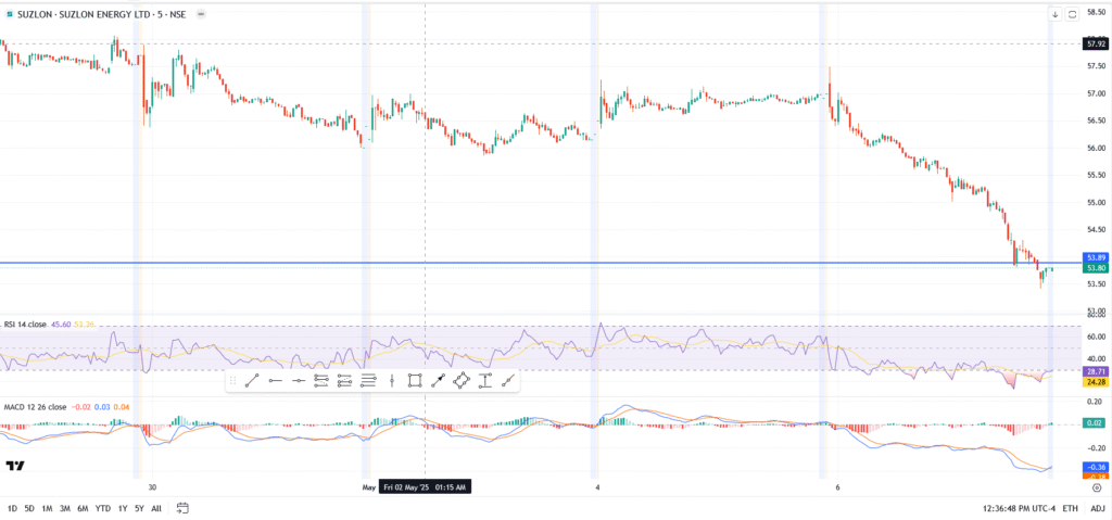 Suzlon Energy (NSE: SUZLON) dropped sharply on Tuesday, closing near ₹53.74 and giving traders a gut check after last week’s range-bound action. After grinding between ₹54 and ₹57 for days, today’s downside breach may be a sign that the bulls are running out of steam, at least for now.