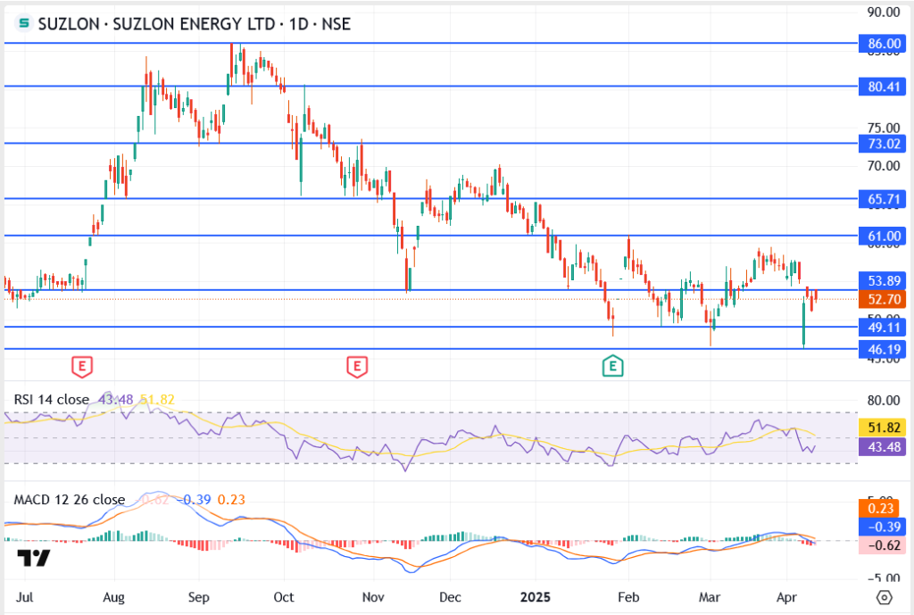 Suzlon Energy shares rallied 5% on Friday, April 11, following a sharp rebound from the ₹46.19 support level. The move comes amid renewed investor interest in clean energy stocks and short-covering after a recent dip. While Suzlon has faced selling pressure over the past few weeks, today’s jump raises a key question — is this a sustainable reversal or just a temporary bounce?