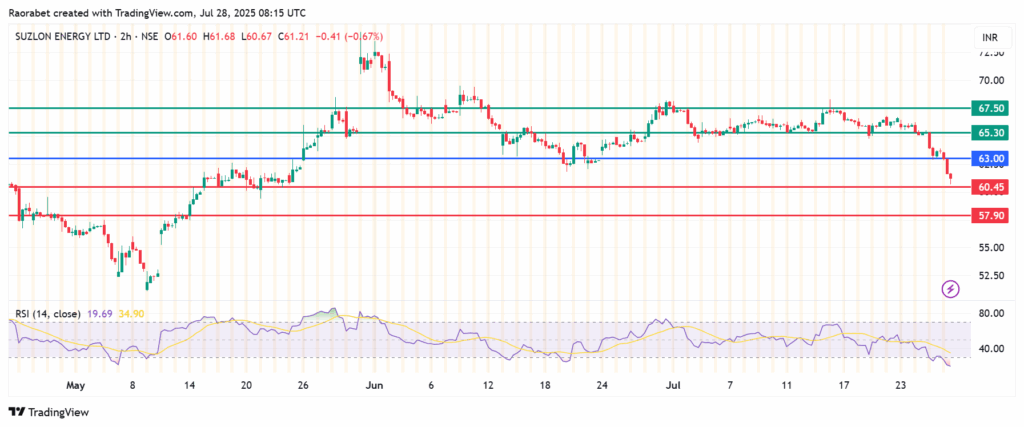 Suzlon Energy share price pivots at ₹63.00 and action below that level signals control by he sellers. The stock will likely have its primary support at ₹60.45. An extended control by the sellers will break below that level and potentially test ₹57.90.