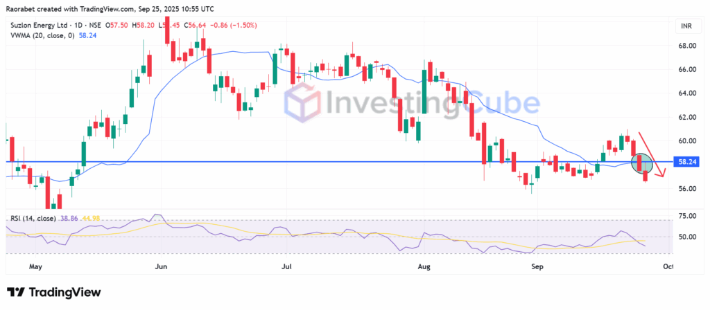 Suzlon Energy stock price has drifted downwards significantly in the last four trading sessions, cooling off from its recent highs. The stock is on a four-day losing streak, reversing a significant portion of the gains registered earlier in September. The stock started the week at ₹60.95 on September 22 but has declined sharply, hitting ₹56.64 as of this writing, which is equivalent to a loss of about a 7.1%. Notably, Suzlon stock price been on a general downtrend year-to-date, and is down by about 9.5% since January.