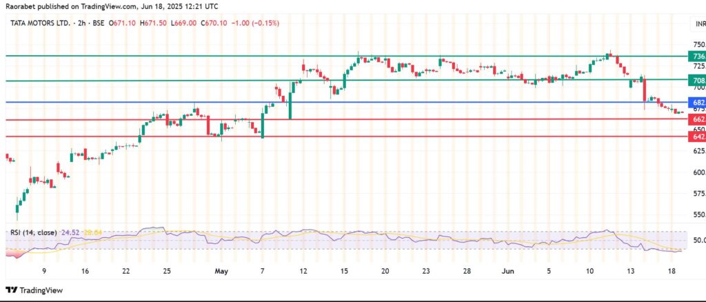 Tata Motors stock price has extended its decline to the third straight session as investors ease their exposure on the back of a revised guidance. News of Jaguar Land Rover (JLR) division reducing its EBIT guidance from 10% to 5%-7% signals trying times for the company amid increased pressure from trade tariffs. The stock has declined by 8.9% in the last five sessions and traded at ₹670 at the time of writing, down by 0.7% on the daily time frame.