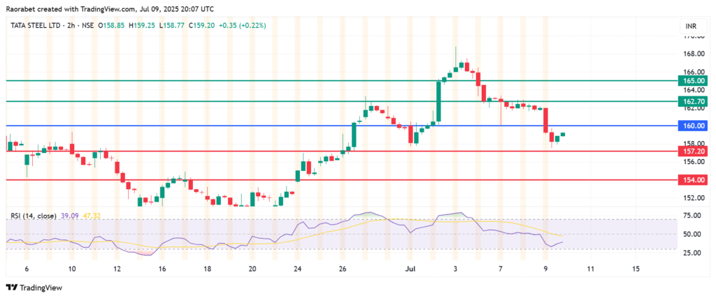 Tata Steel share price pivot mark is at ₹160 and the momentum calls for further downside. The stock will likely find initial support at ₹157.20. Breaking below that level will signal a stronger momentum that could extend losses to test ₹154.