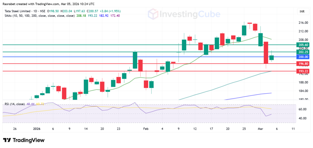 Tata steel stock price pivots at the psychological ₹200 level, with the rising RSI indicating control by the buyers. It will find immediate support at ₹196.80. A stronger, more reliable level is at ₹193.22, which is the same as its 50-day Simple Moving Average (SMA) level. The stock will likely meet the first key resistance at ₹202.25. Above that, its will likely test ₹205.60. To kickstart the reversal, the stock needs to close above ₹212.