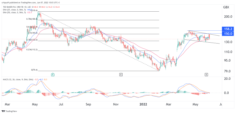 The daily chart shows that the Ted Baker share price has been moving sideways in the past few days as investors watch the bidding war. The shares are trading below the 50% Fibonacci Retracement level. The stock has formed a descending channel shown in black. This channel has a close resemblance to a bullish flag pattern.