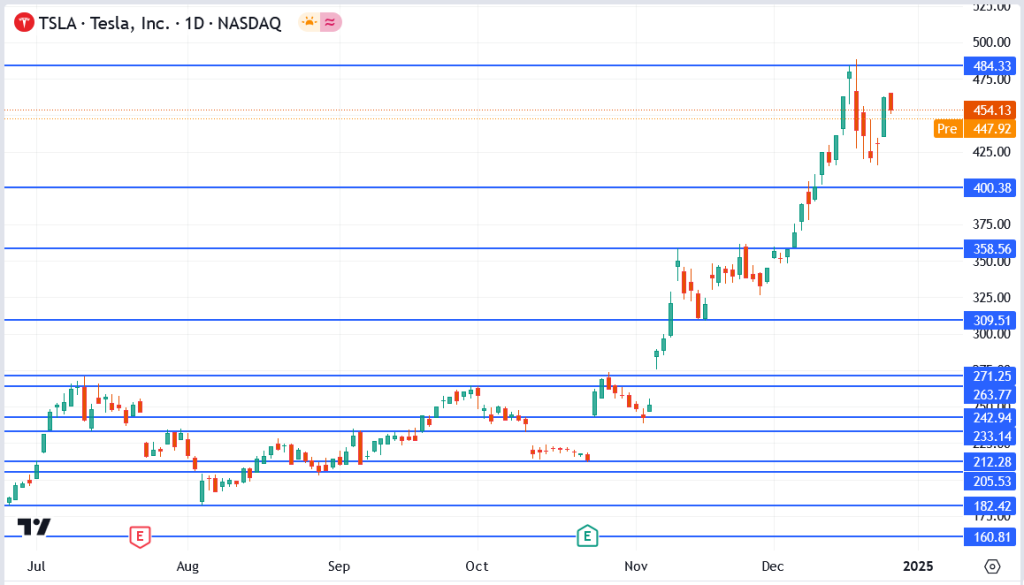 The chart highlights important support and resistance levels that could shape Tesla’s short-term price movement: