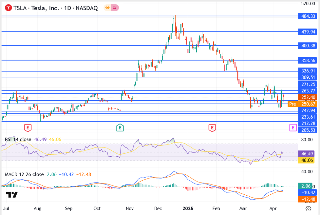 - Major Support: $233.61 and $212.28 – Failure to hold these zones could drag TSLA back toward the $205.53 low.