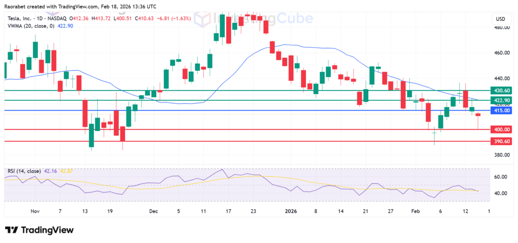 Tesla stock on the daily time frame with key levels of resistance and support on February 18, 2026. Created on TradingView