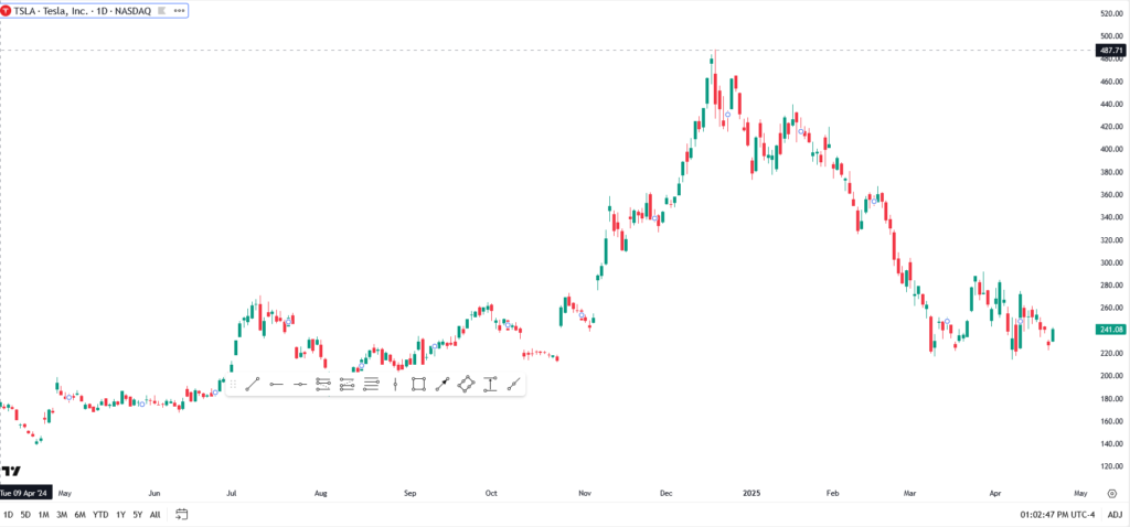Tesla Inc. (NASDAQ:TSLA) is under pressure ahead of its Q1 earnings. Trading at $241.08 down over 43% from the December 2024 peak of $487.71 and -35 % year to date. Investors are watching closely to see if the EV giant can reverse this trend or fall deeper into correction territory.