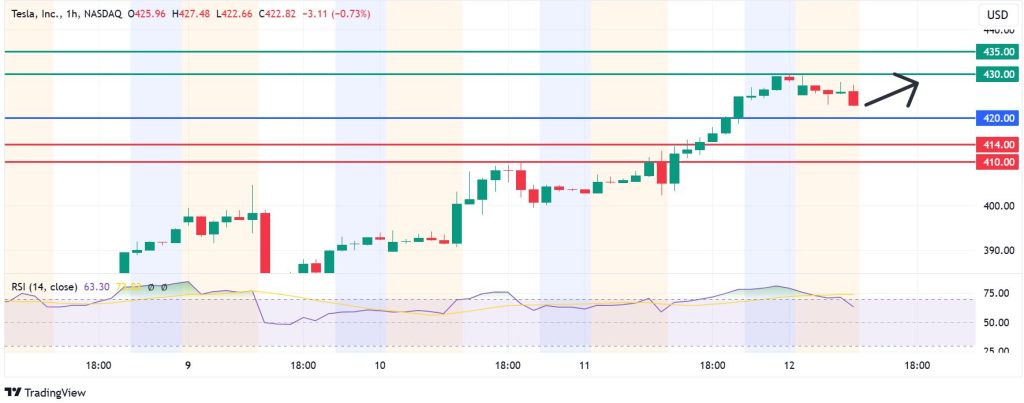 Tesla stock price pivots at $420, and the RSI indicator calls for further upside. With the buyers in control, the stock will likely encounter the fisr resistance at $430. However, an extended upward momentum could break above that level and test $435.