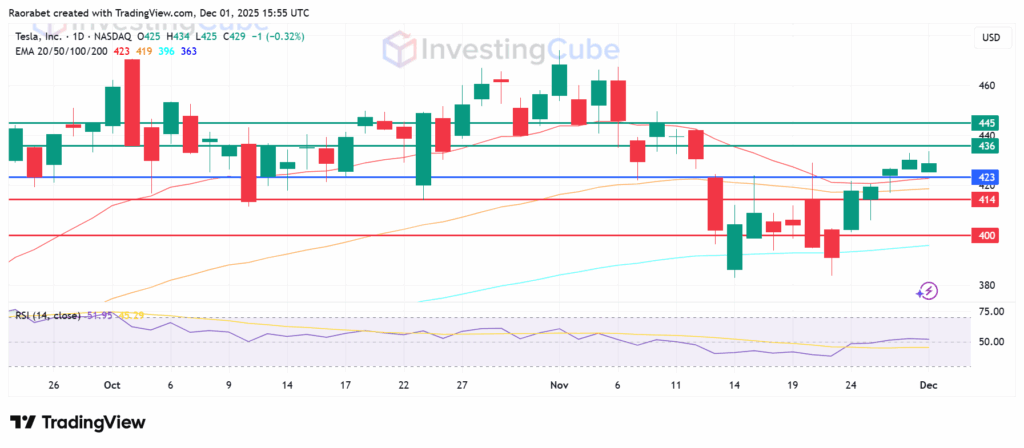 Tesla stock seems to pivot at $423, which is the 50-day EMA. The RSI at 51 favours the buyers to be in control, and initial resistance will likely be at $436. Breaking above that level will signal a stronger bullish hold, and such momentum could send TSLA higher to test $445. On the other hand, going below $423 will invite the sellers to take control. That will likely see the first support established at$414. If that support is broken, the stock could go lower and test $400.