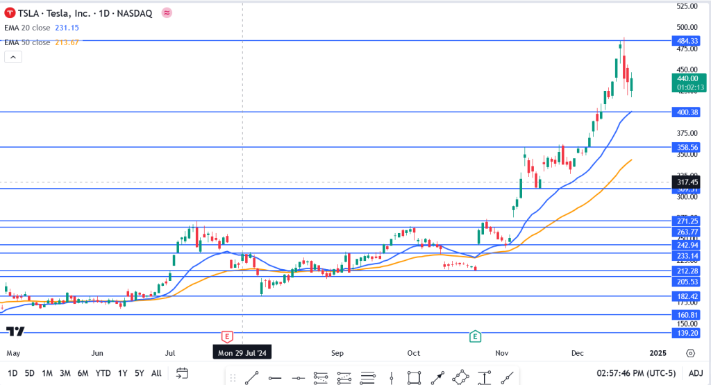 This year, Tesla has soared an impressive 93%, with a post-election rally driving its market cap up by $735 billion and pushing the stock to a December peak of $484.33. Since then, it has eased to $400.38, leaving investors deliberating whether to ride out the momentum or secure their gains.