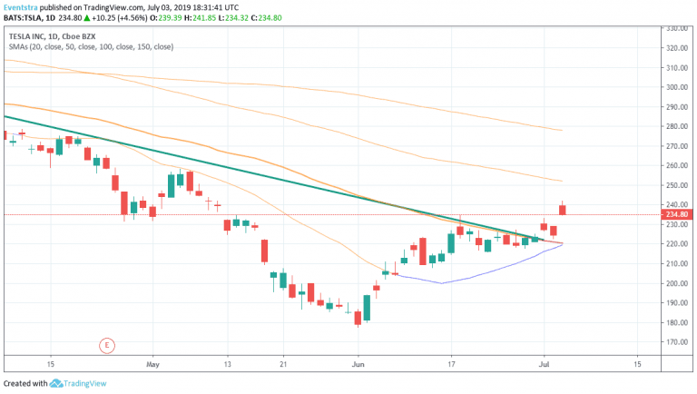 On the technical side, TSLA stock is trading above the 20 and 50 day moving averages and has broken the weekly downward trending channel with higher than average daily volumes. Immediate resistance for TSLA stands at $251 the 100-day moving average, and more offers will probably emerge at the 150 day moving average at 277. On the downside first support can be found at $220, the 50 day moving average, while the followed by the June 12th low at $208.Don’t miss a beat! Follow us on Twitter.