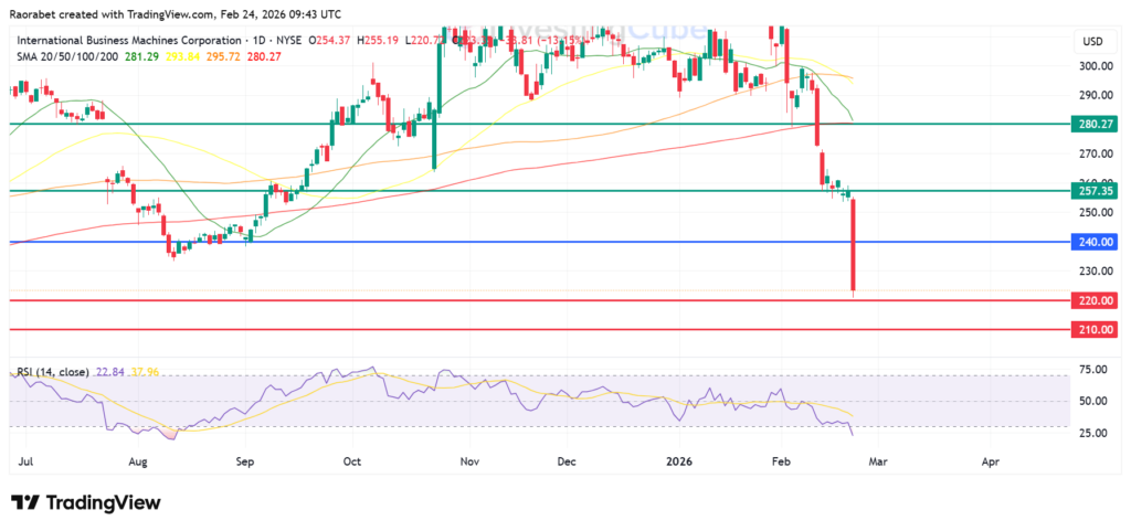 IBM shares show a low RSI, under 25, hinting at possible upward movement after recent drops. Nearby floor appears around $220, a key point that might hold for now. Should that break, eyes turn to $210. An extended control by the sellers could test $200, seen as critical by patient investors watching closely. On any rise, hurdles loom ahead. The primary resistance is likely to be at $257, then $280 stand tall in opposition.