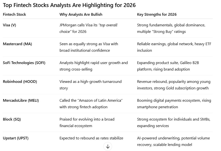 Analysts expect the strongest fintech stocks in 2026 to benefit from steady digital payments growth, wider AI adoption, and more stable regulatory frameworks. The consensus outlook points to established payment networks and fast-scaling digital platforms as the most resilient performers in the financial technology market.