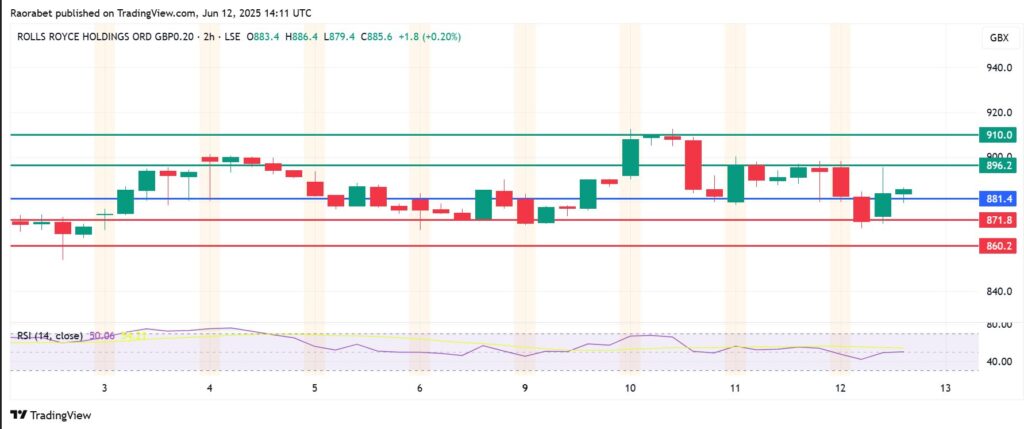 Pivot: Rolls Royce share price pivot is at 881.4p. The momentum favours the upside to prevail above that level. Conversely, breaking below that level will shift the momentum to the downside.