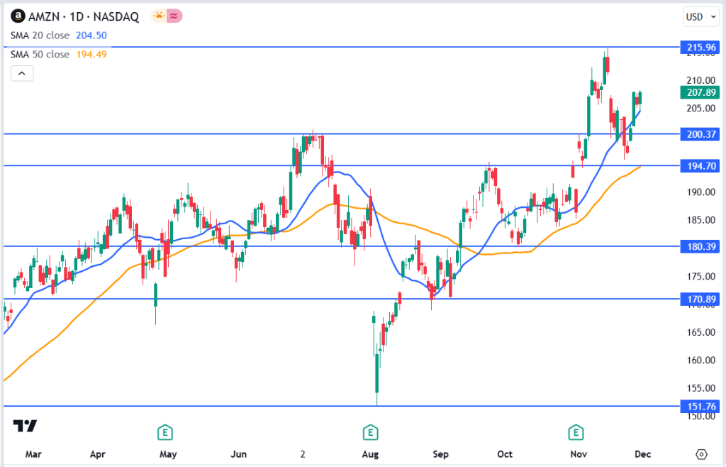 Amazon’s stock is showing positive momentum heading into the holiday season. A breakout above $208 would likely push the stock toward $215 resistance. However, any unexpected macroeconomic headwinds or disappointing sales numbers could see the stock fall back to $200 or lower.