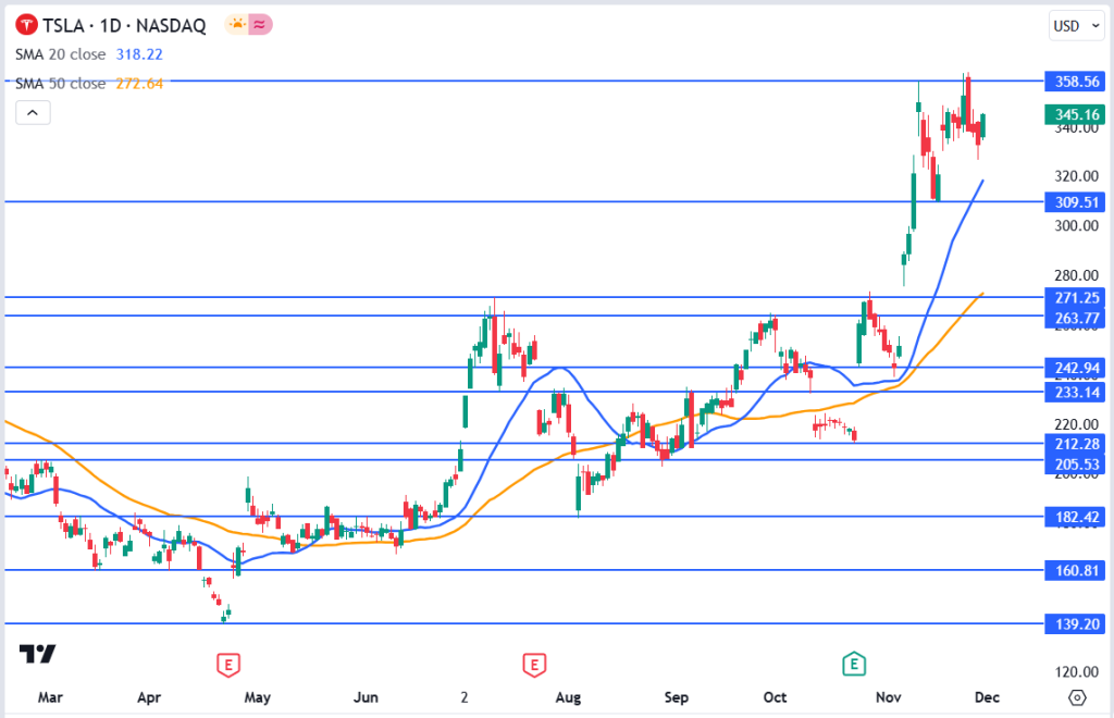 If Tesla continues to hold above the $345 mark, a test of $360 resistance looks likely in the short term.