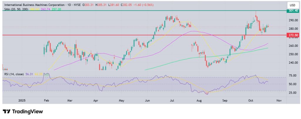 From a technological point of view, IBM looks like it will go up. According to TradingView charts, it recently broke over the 20-day moving average. Its 50-day moving average at $269 is higher than its 200-day moving average at $260.3, which is a bullish sign. Support will likely come around $272.50 and resistance could come around $301.40 (the 52-week high). Happy trading!