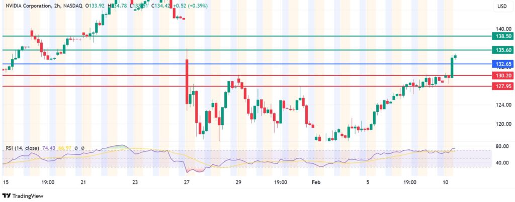 Pivot: Nvidia stock price pivots at $132.65 and the momentum signals bullish control. However, slipping below that level could shift the momentum to the downside.