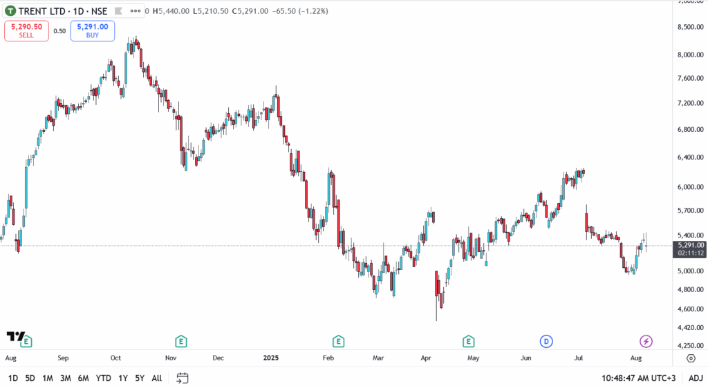 Trent Ltd (NSE: TRENT) dipped on Thursday, with shares falling 1.22% to ₹5,291, even as the company posted a solid Q1 performance. The market’s reaction? Not exactly enthusiastic, but there’s more to the story than the red on screen.