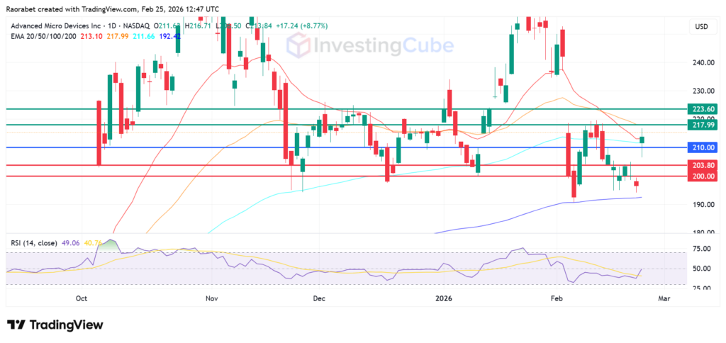 If Nvidia’s stats beat forecasts, AMD will probably follow that trend and test the $220 barrier level again. But if Nvidia’s guidance shows that AI capital spending is slowing down even a little, AMD’s recent 8% surge could go away. Some of the biggest dangers are Nvidia’s increased rivalry, possible delays in new chip ramps, and a general lack of interest in AI investing if it doesn’t pay off.