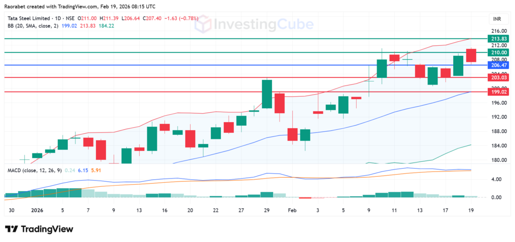 Tata Steel stock is currently trading at ₹207.40 and pivots at ₹206.47. The MACD is at 6.15, which is above the signal line and is a classic sign of a bullish trend. The stock is facing immediate resistance at ₹210. If it breaks above this level, it could start a run toward the upper Bollinger Band level at ₹213.83.