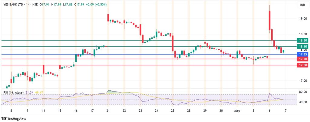 The momentum on Yes Bank share price favours it tpo stay above the pivot mark at Rs 17.85. The first hurdle will likely be at Rs 18.10. However, a stronger momentum will breach that barrier and test the second one at Rs 18.30.